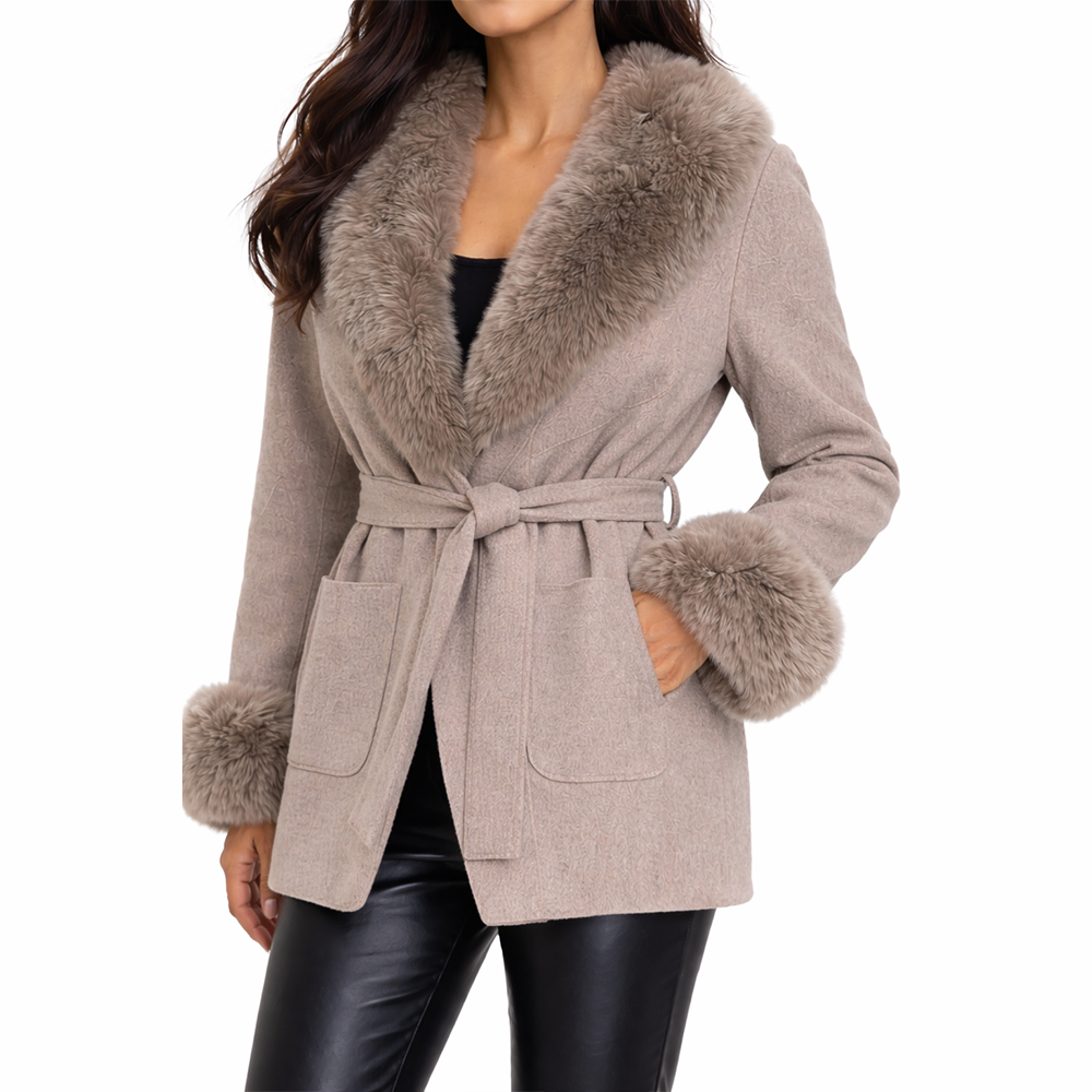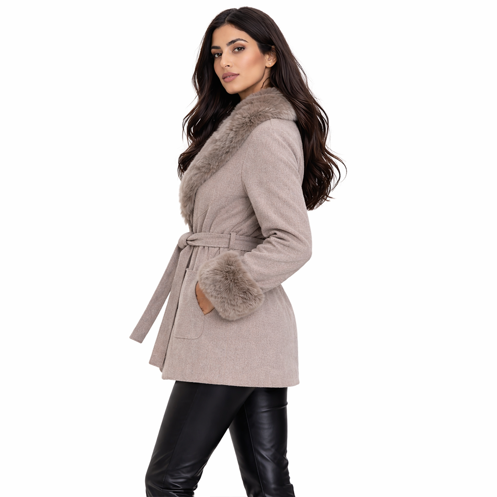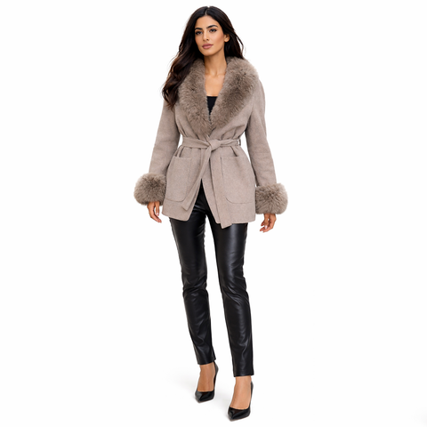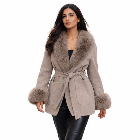 Vivienne Fox Coat is a refined winter essential designed for effortless elegance. Crafted from a premium wool blend, this tailored coat features a plush genuine fox fur collar and cuffs that add softness, warmth, and understated luxury. The structured silhouette is finished with a self-tie belt to define the waist, creating a flattering and feminine shape while maintaining a clean, sophisticated look.