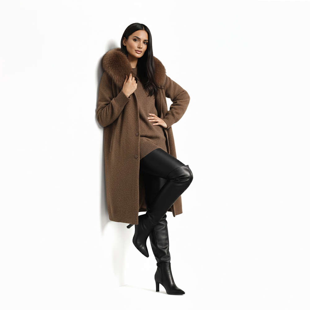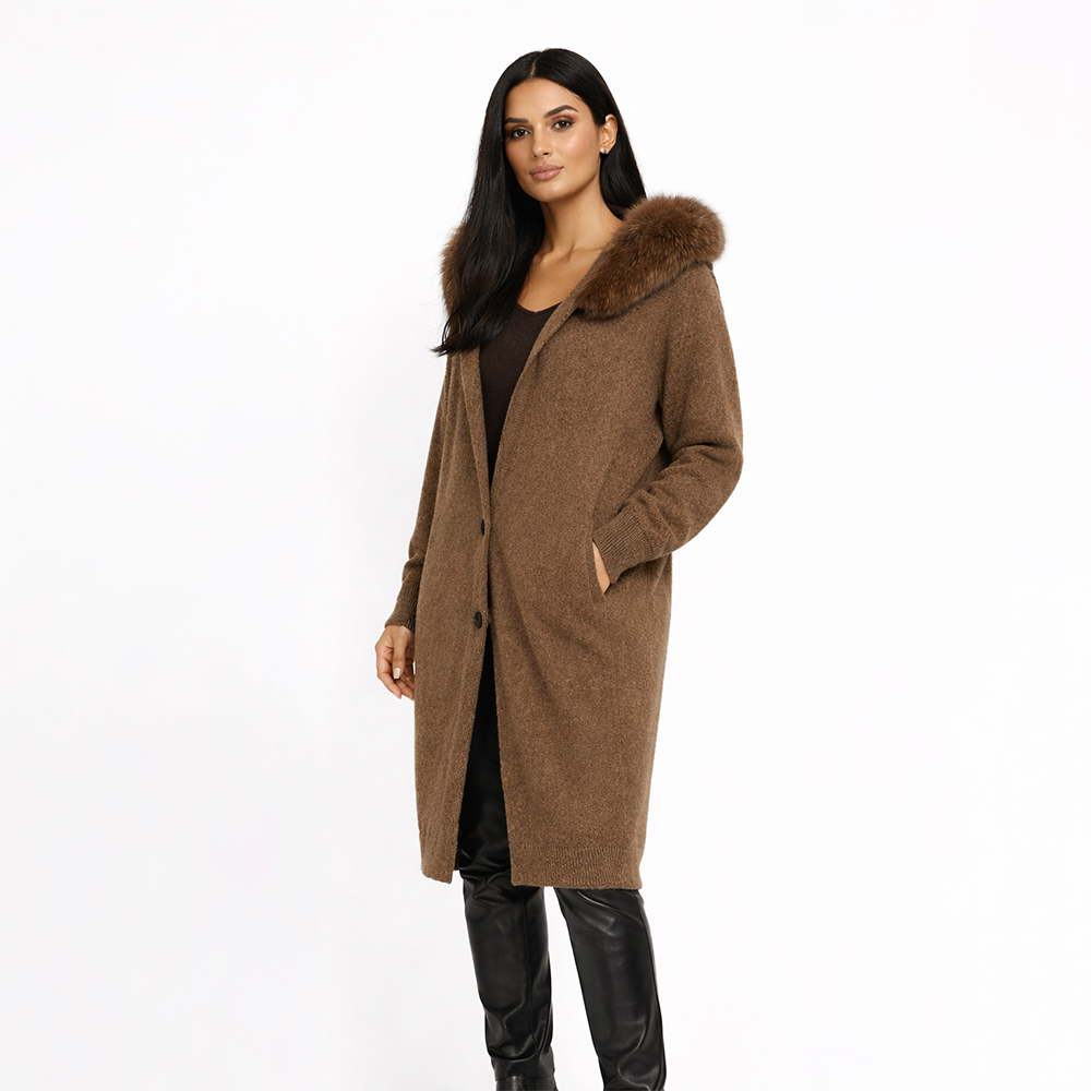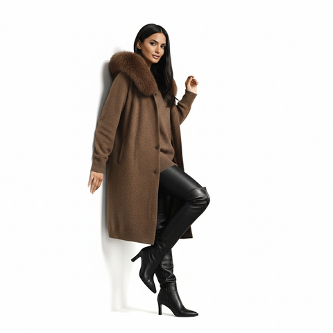 Cacao Long Fur Sweater is crafted from a soft cashmere-wool blend, designed in a refined longline silhouette for effortless elegance. Finished with a plush fur-trim hood and subtle button detailing, it delivers warmth with understated luxury.