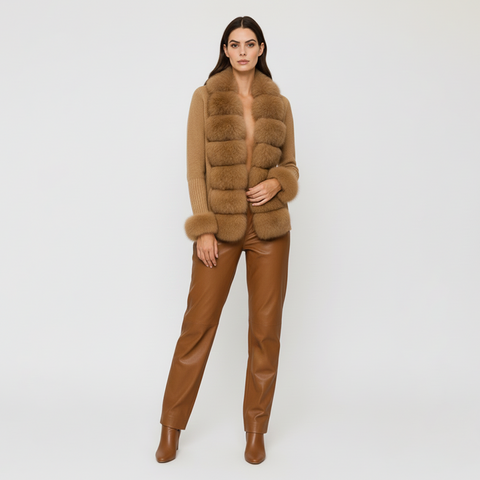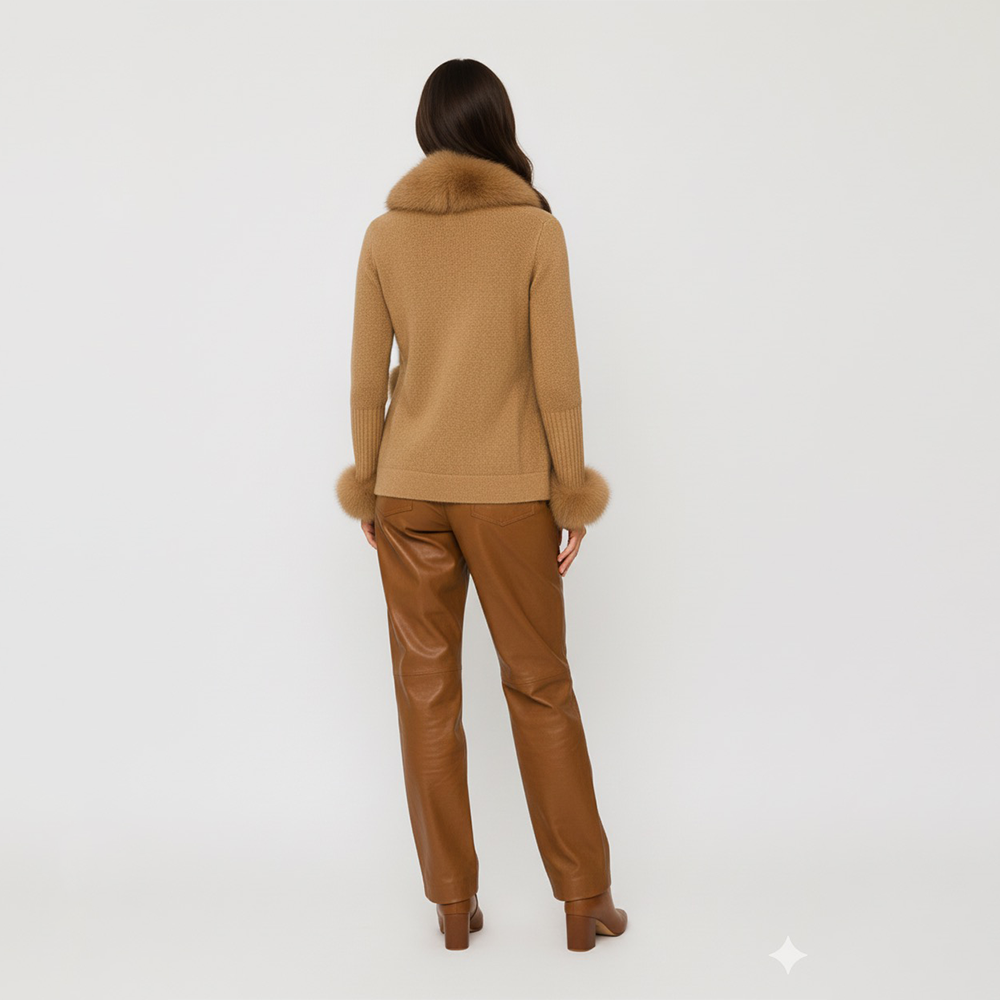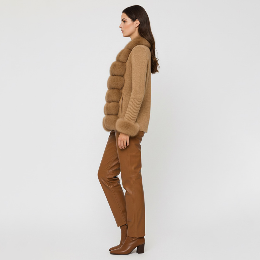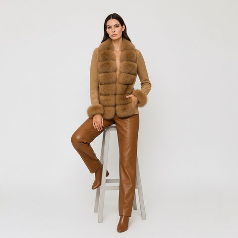 The Lana Fox Fur Sweater combines irresistible softness with refined winter elegance. Crafted with a velvety Rex fur front in a luxurious silver-grey gradient and paired with ribbed cashmere-blend sleeves, this piece delivers warmth, comfort, and a sculpted feminine silhouette.The high funnel collar adds a chic, modern touch, perfect for winter layering, travel, or elevated day-to-night outfits.