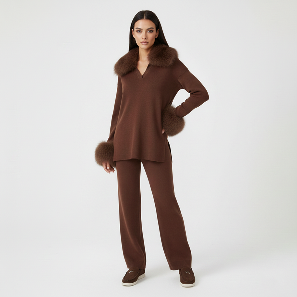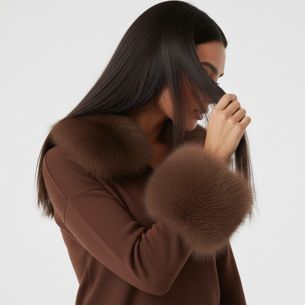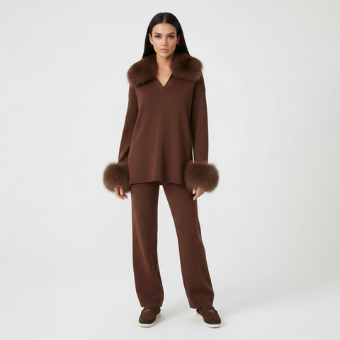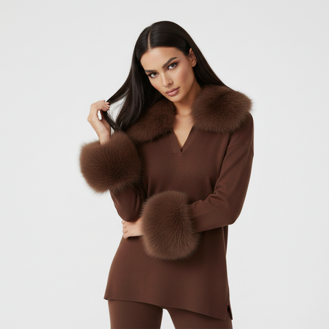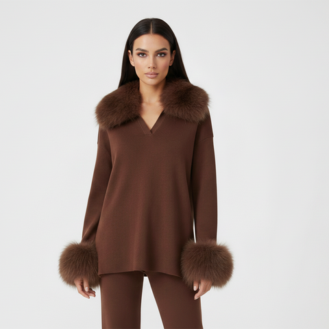 Discover effortless luxury with the Mayfair Chestnut Luxe Set, crafted from a soft cashmere wool blend and finished with plush fox-fur cuffs and a statement fur collar. This two-piece set drapes beautifully, offering warmth, comfort, and a refined silhouette for everyday elegance.