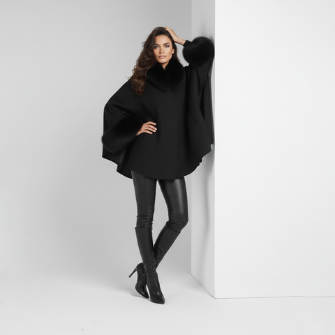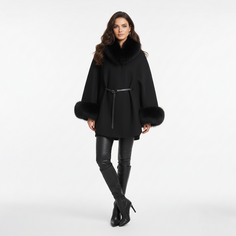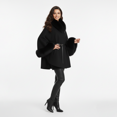 Isabella Fox Black Cape embodies quiet power and elevated sophistication. Crafted in a flowing cape silhouette, it features luxurious genuine fox fur trim at the collar and cuffs, adding depth and intensity to the design. Finished with a sleek waist belt for subtle shaping, this piece is designed to transition seamlessly from evening wear to statement outerwear. Confident, refined, and unmistakably luxe.