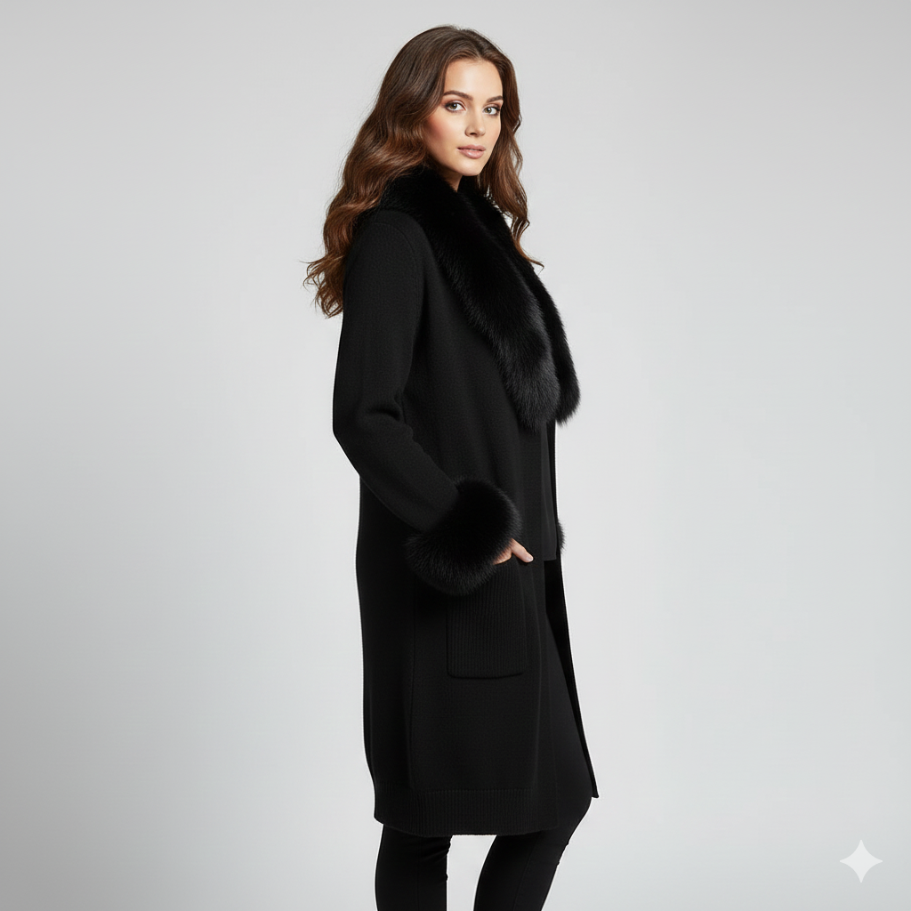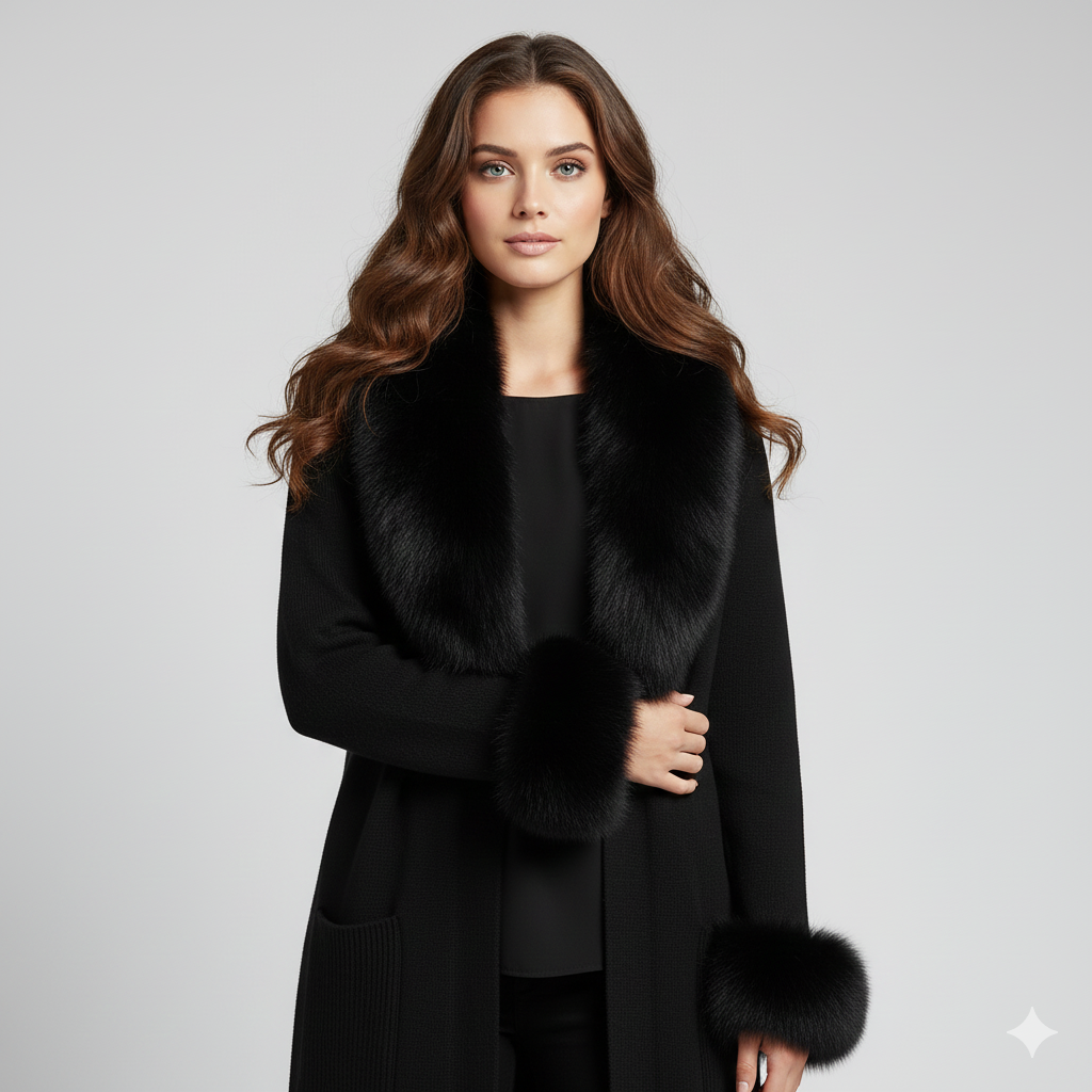 A timeless winter essential our Firenze Noir Sweater is crafted from a rich cashmere–wool blend and finished with a luxurious full fox-fur shawl collar and voluminous fox-fur cuffs. Designed in an elegant longline silhouette, this coat brings warmth, structure, and understated luxury to any outfit.