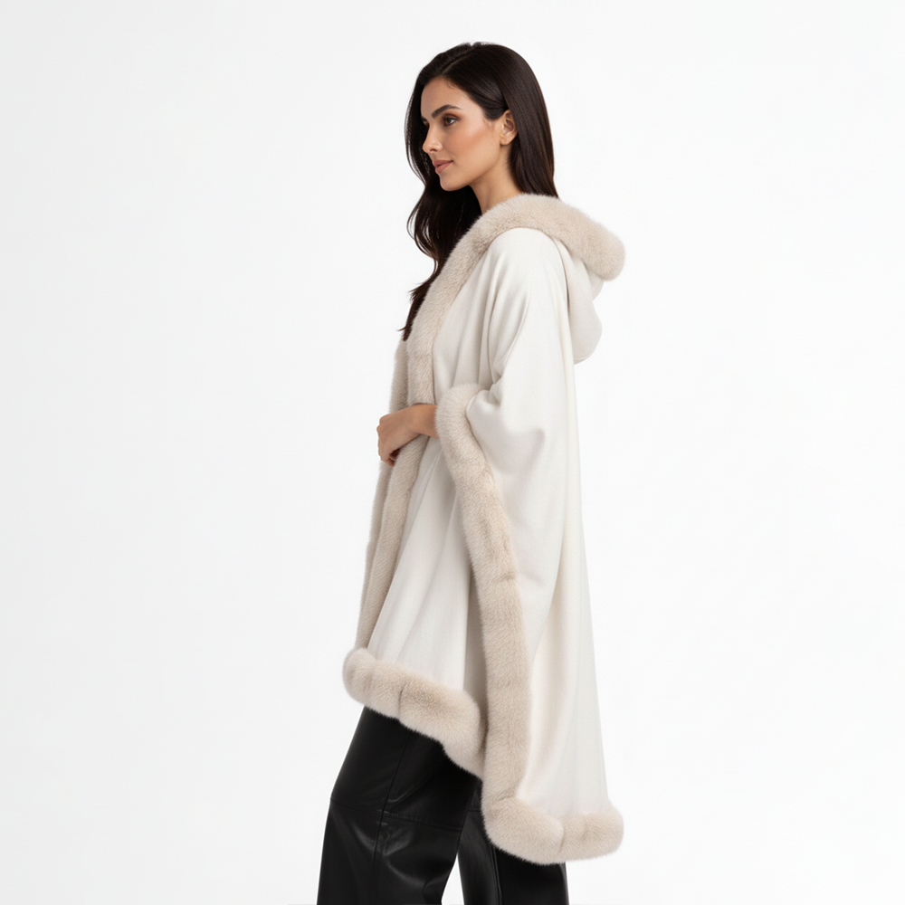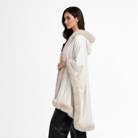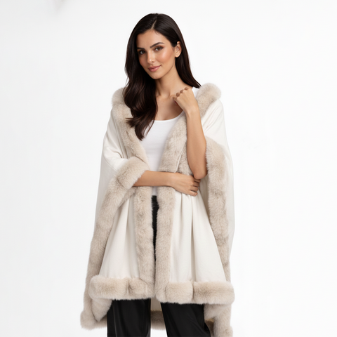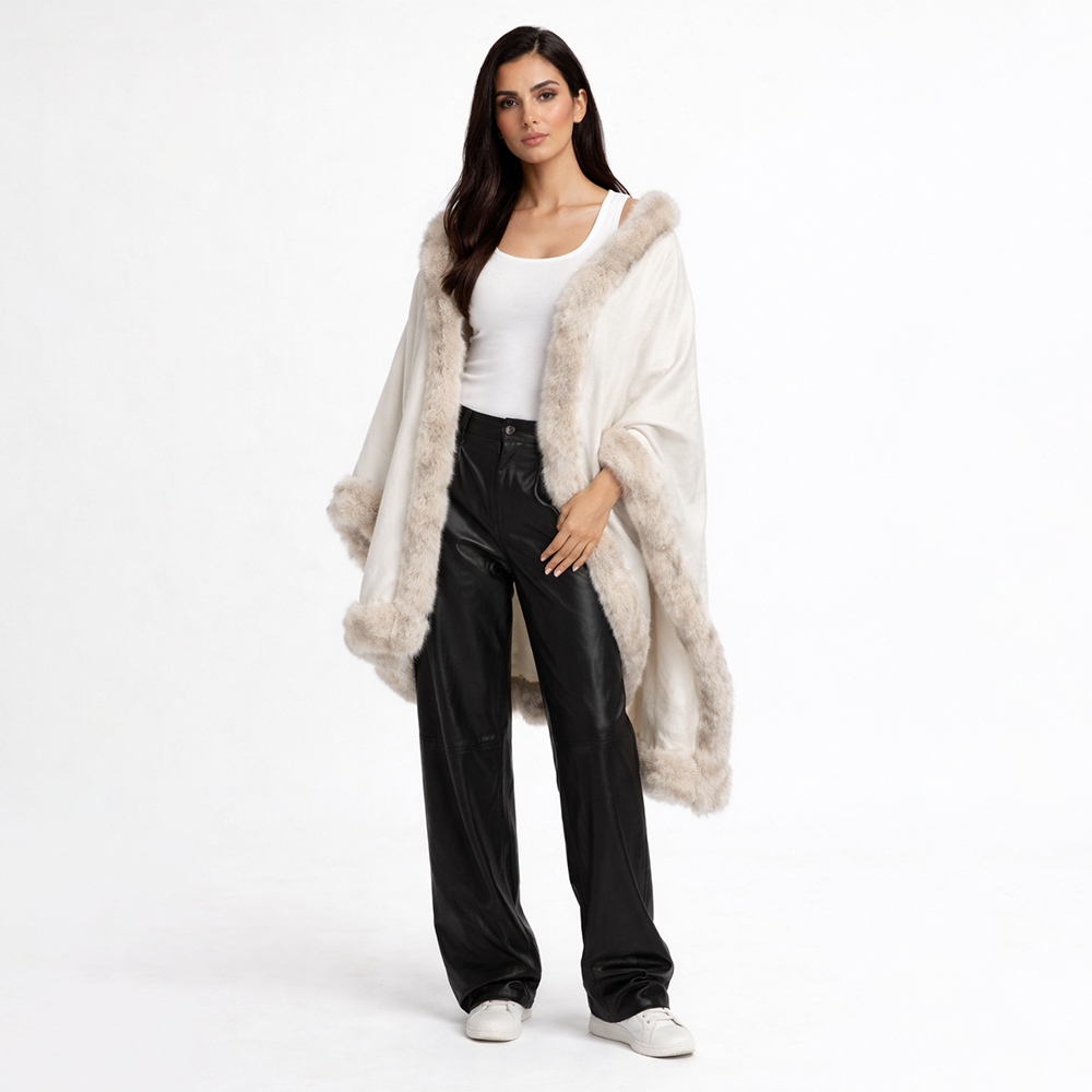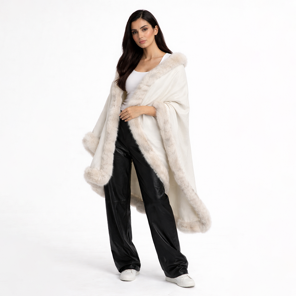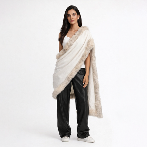 A refined white shawl crafted from soft cashmere and finished with plush genuine fox fur trim. Designed to drape effortlessly over the shoulders, Blanc Mont adds understated luxury to both day and evening looks.