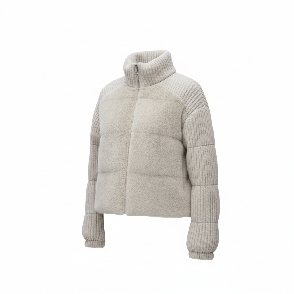 Mayfair Cloud Mink Puffer is a statement piece crafted for modern winter elegance. Featuring a full mink-fur front paired with sculpted cashmere knit puffer sleeves, this jacket blends softness, structure, and warmth in the most luxurious way. The tall ribbed collar adds a refined, chic finish while keeping you perfectly insulated.