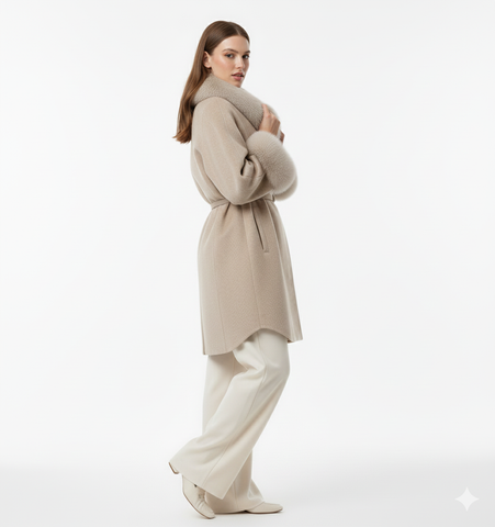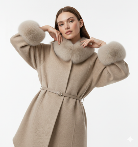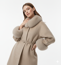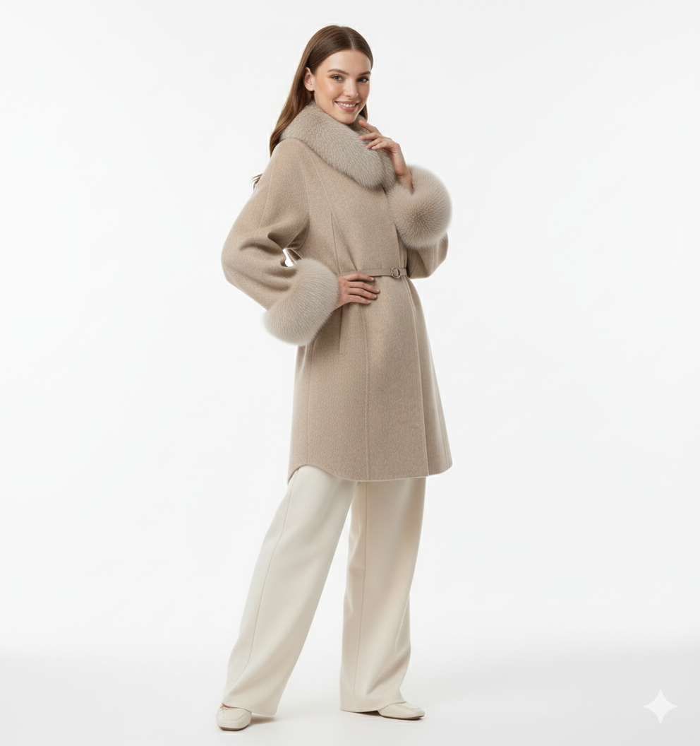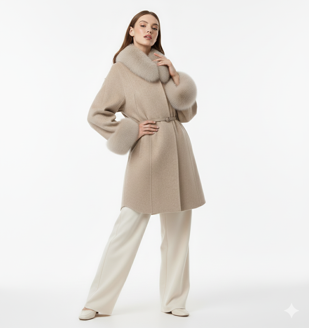 Belmont Sand Fox Cape Jacket is a timeless statement of understated luxury. Crafted from a premium wool blend, this elegant cape-style jacket is finished with a plush genuine fox-fur collar and cuffs, adding softness, volume, and a refined winter glow.