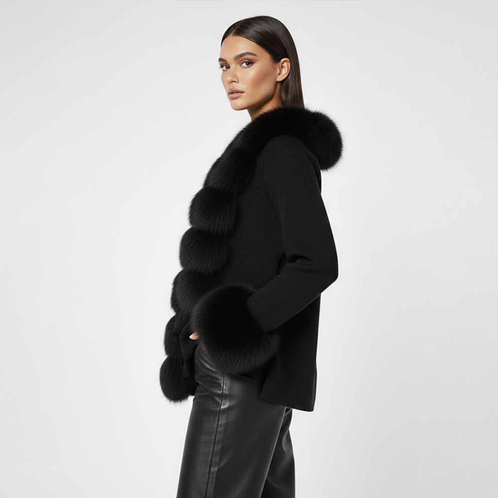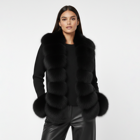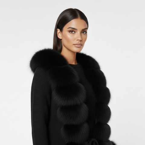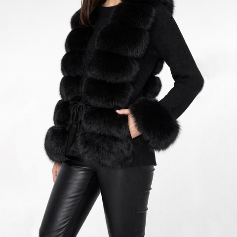 Lana Fox Black Fur Sweater is a statement of pure winter luxury. Crafted with a structured fox-fur panel front and paired with a cashmere knit body and sleeves, this piece blends warmth, softness, and elegance. The deep black tone makes it a timeless wardrobe staple, perfect for elevated evening looks or chic daytime layering.