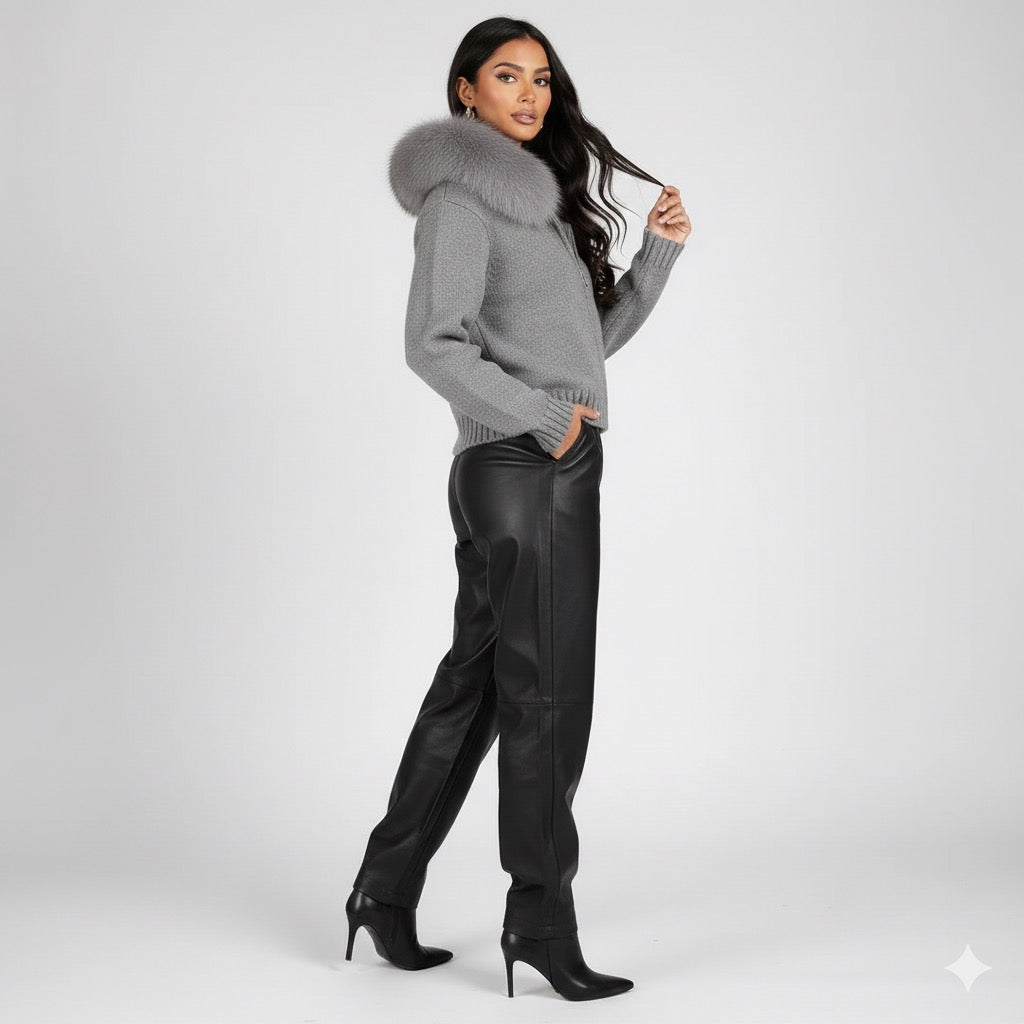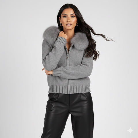 The Milano Fox hooded Sweater brings together modern luxury and everyday comfort. Crafted from a premium wool knit and finished with a plush genuine fox-fur hood, this piece offers exceptional softness, warmth, and a beautifully structured silhouette. The zip-front design and ribbed details make it perfect for elevated casual looks, winter layering, and travel.