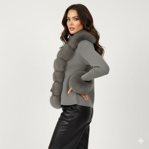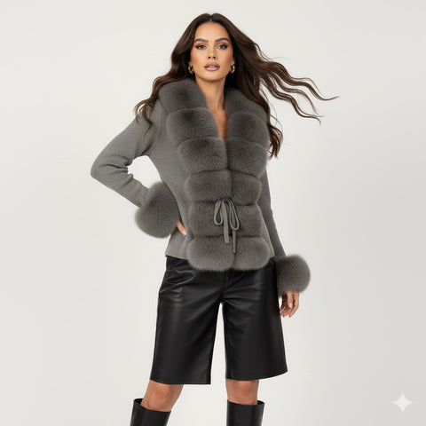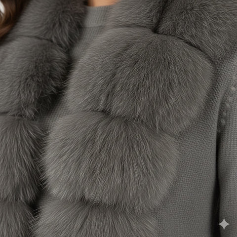 Lana Fox Grey Fur Sweater is designed to sculpt the silhouette while delivering elevated winter luxury. Crafted from a premium knit base, it features plush genuine fox-fur trim along the front and cuffs, finished with a softly cinched waist for a flattering, feminine fit.