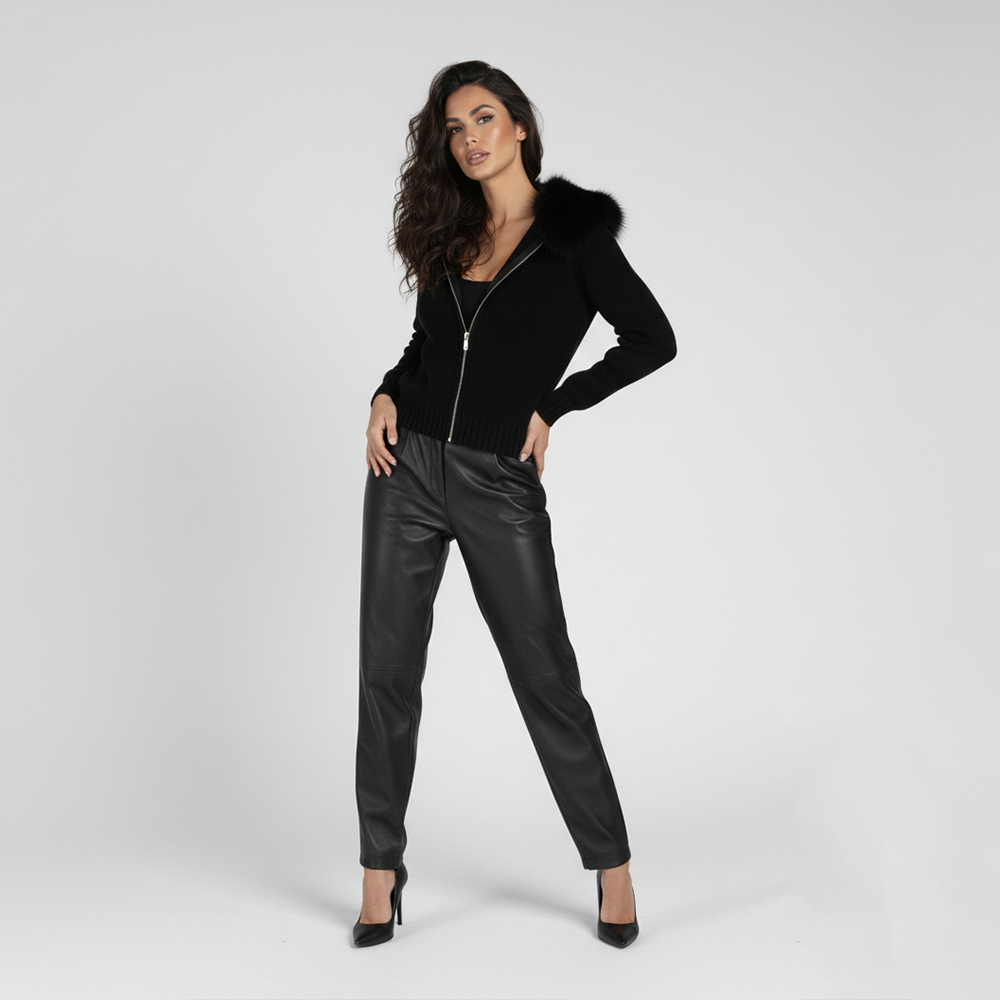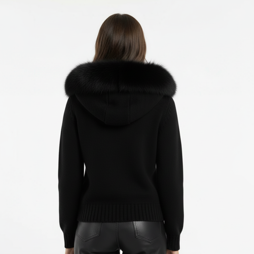 Sloane Fox Hooded Sweater is crafted from a soft premium knit, it features a genuine fox fur hood and a sleek zip-front silhouette for effortless luxury.