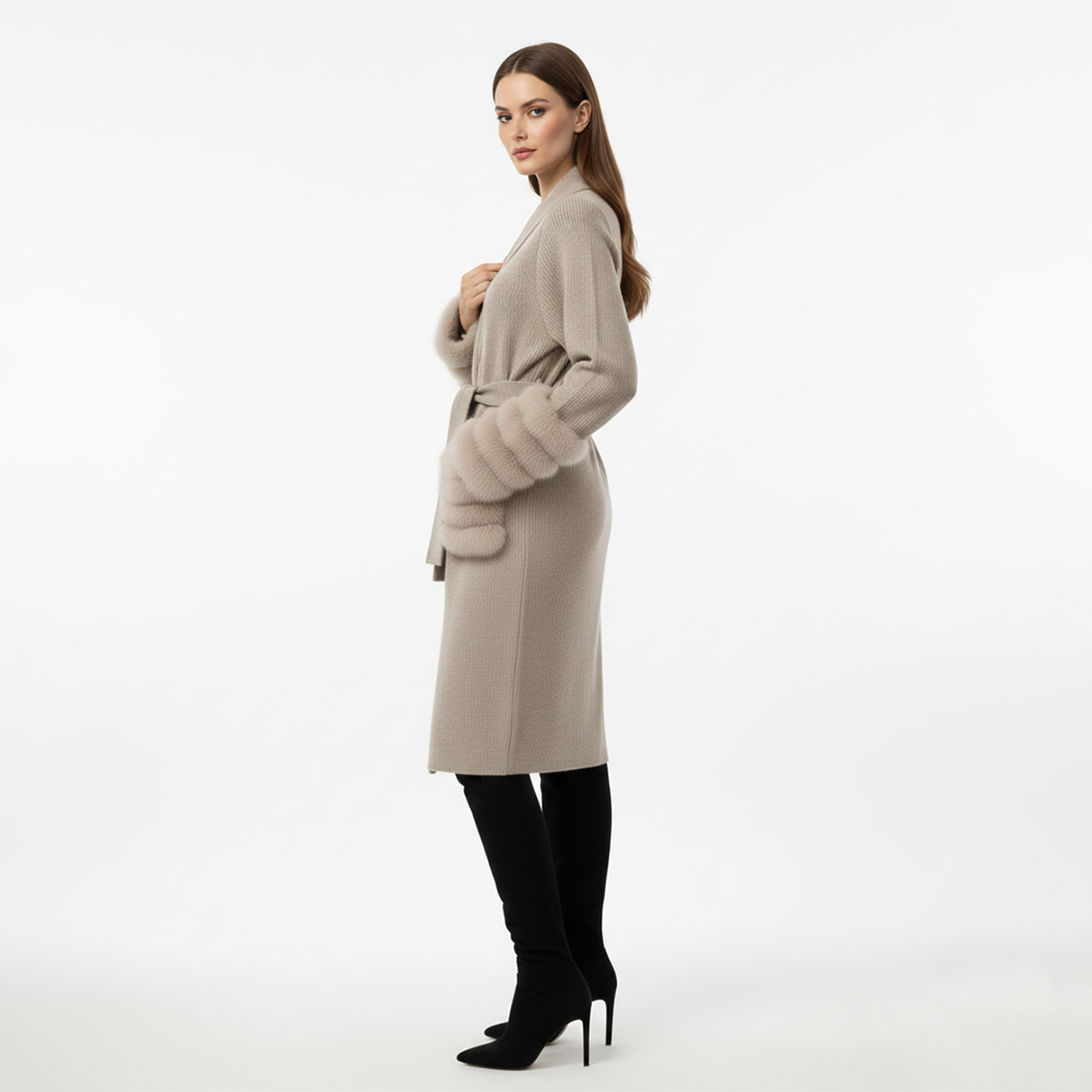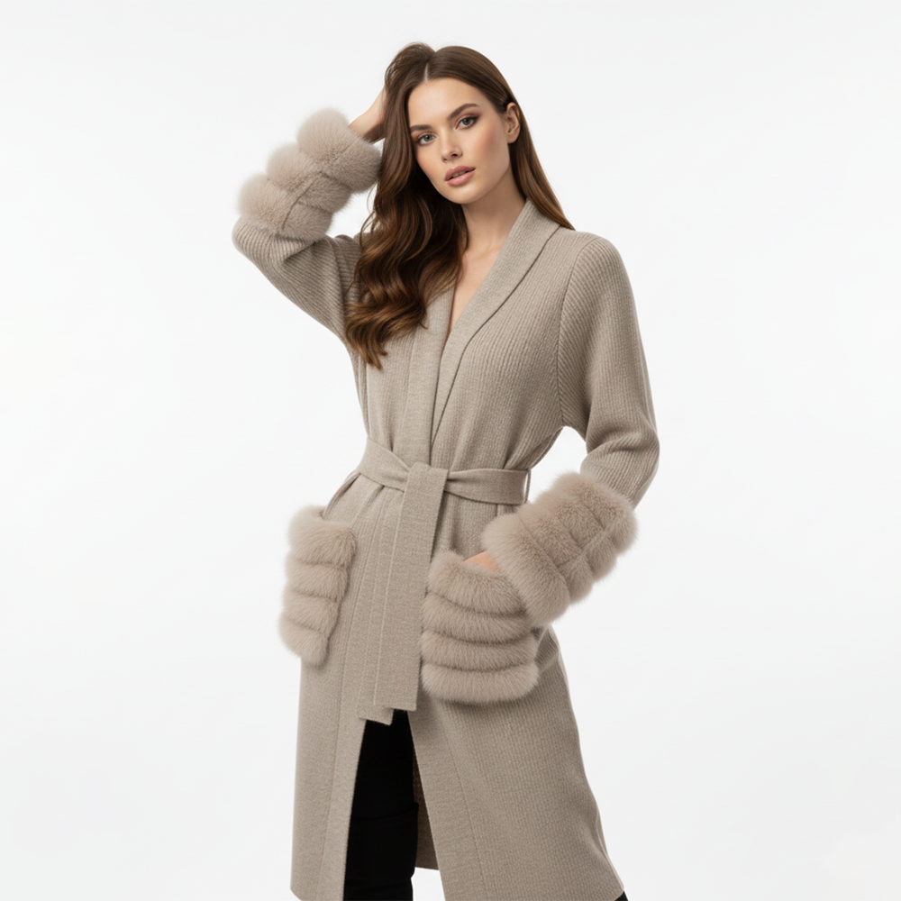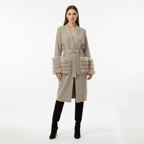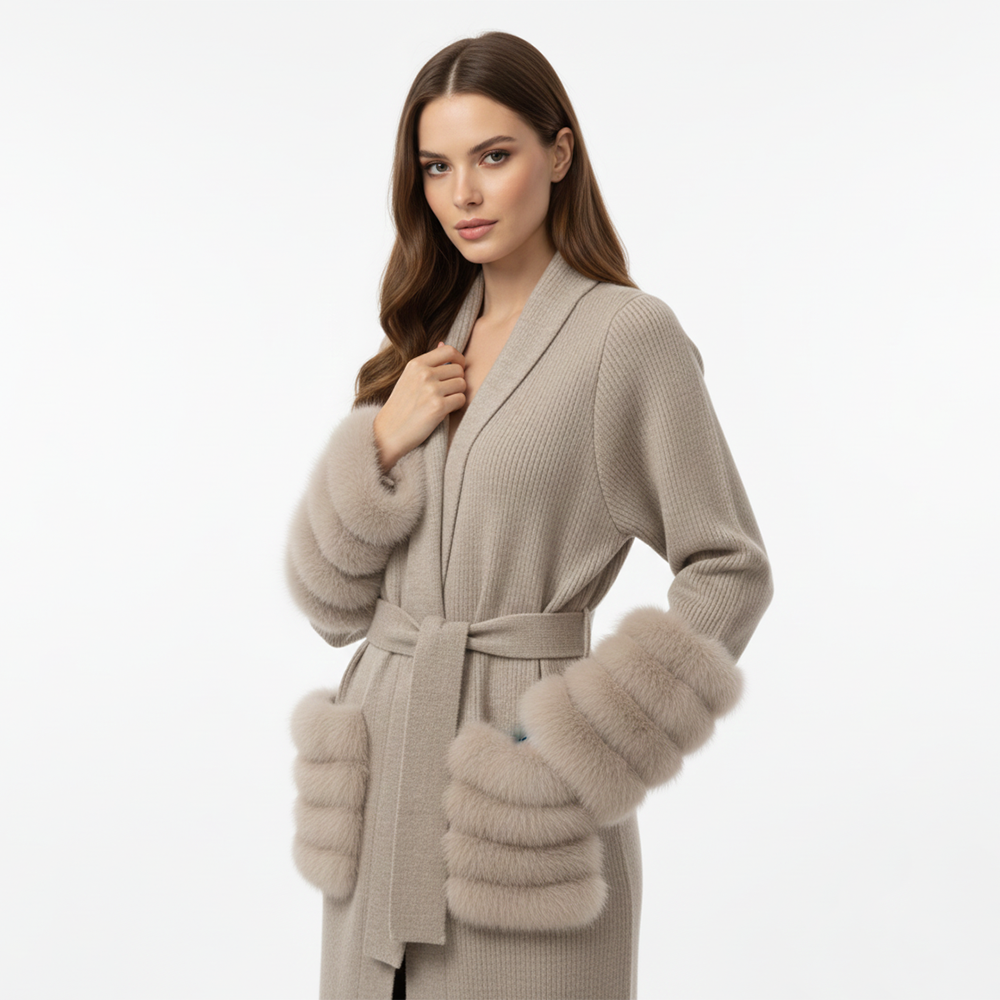Its standout detail is the tiered genuine fox-fur cuffs and pockets, adding soft volume, warmth, and a luxurious statement finish. The sand-beige hue brings a timeless, neutral charm, making this sweater an essential layer for elevated everyday dressing and travel.