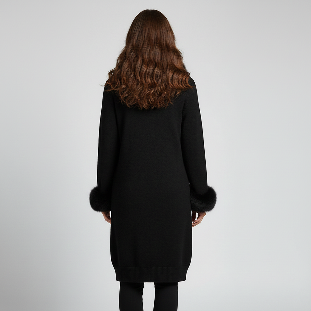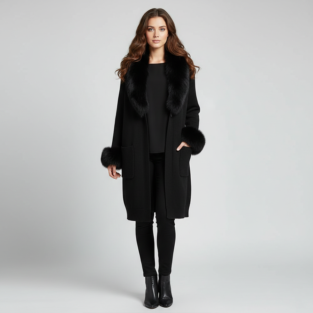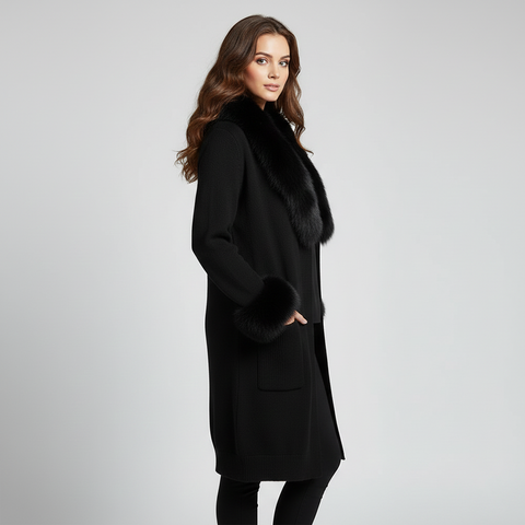 A timeless winter essential our Firenze Noir Sweater is crafted from a rich cashmere–wool blend and finished with a luxurious full fox-fur shawl collar and voluminous fox-fur cuffs. Designed in an elegant longline silhouette, this coat brings warmth, structure, and understated luxury to any outfit.